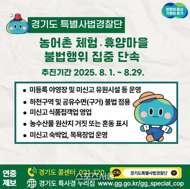 〔스포츠서울│수원=좌승훈기자〕경기도는 8월 한달 도내 124개 농어촌 체험·휴양마을에서 발생하는 다양한 불법행위를 집중 단속한다고 20일 밝혔다.