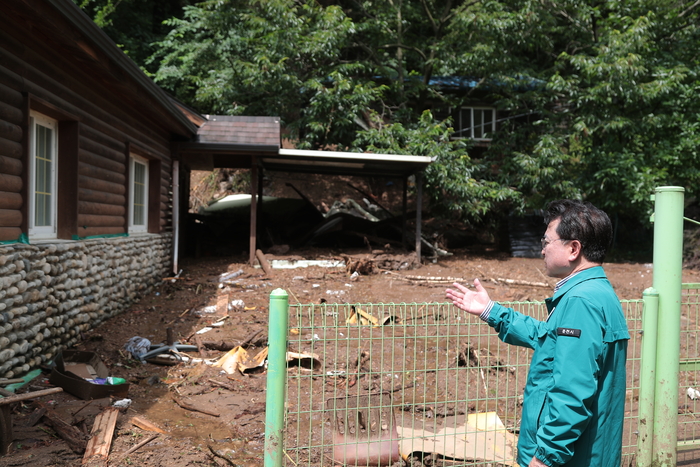 [스포츠서울ㅣ춘천=김기원기자]육동한 춘천시장이 20일 사북면 고탄리, 원평리, 지암리와 서면 안보리 등 호우 피해 발생지 긴급 현장 점검에 나섰다. 춘천시에 따르면 이날 오전 9시 기준 집중 호우 피해 상황은 나무 전도, 토사 유출, 도로 침수 등 42건으로 집계됐다.