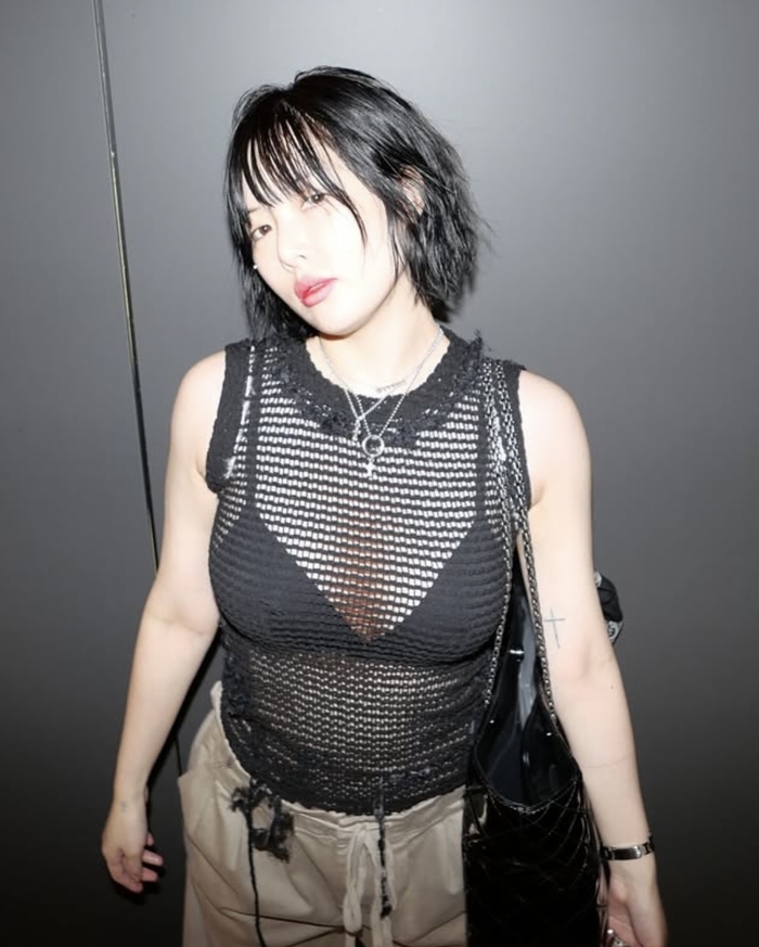 특히 시스루 디테일이 돋보이는 망사 소재의 블랙 슬리브리스 톱에 로우라이즈 팬츠를 매치하여 과감하면서도 섹시한 매력을 한껏 발산했다.