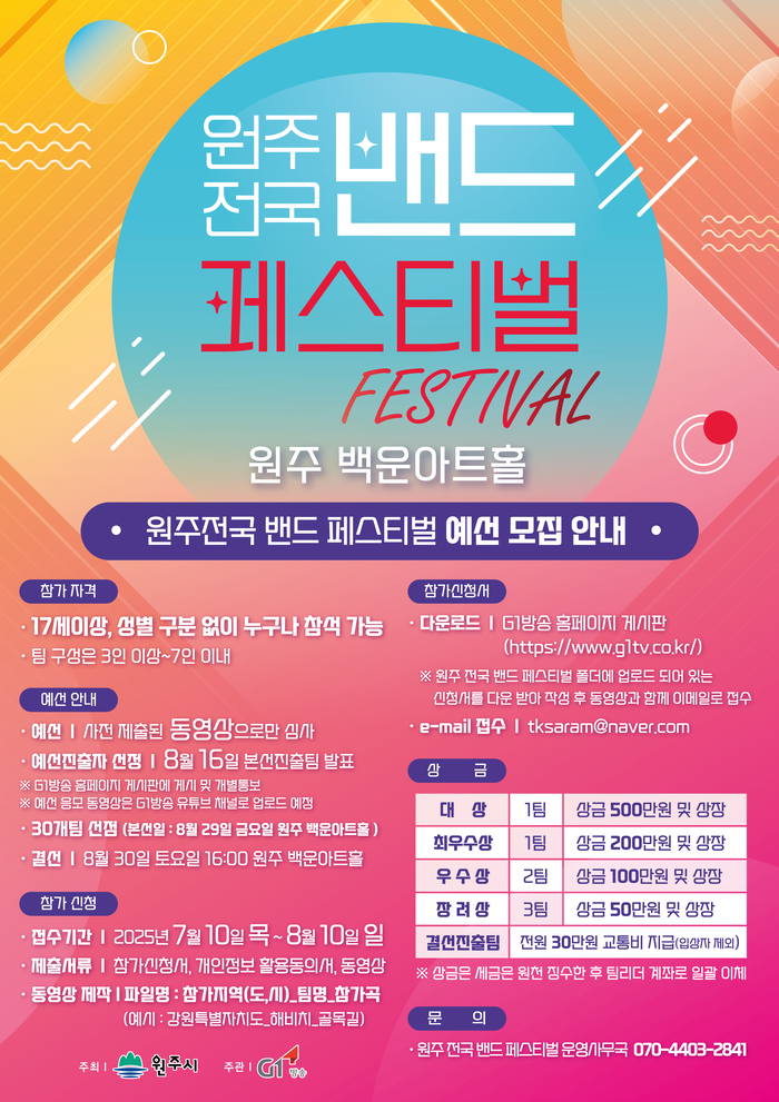 박혜순 문화예술과장은 “이번 페스티벌은 단순한 경연을 넘어 ‘음악과 축제의 도시 원주’의 가능성과 열정을 전국에 알리는 상징적인 자리가 될 것”이라고 말했다.