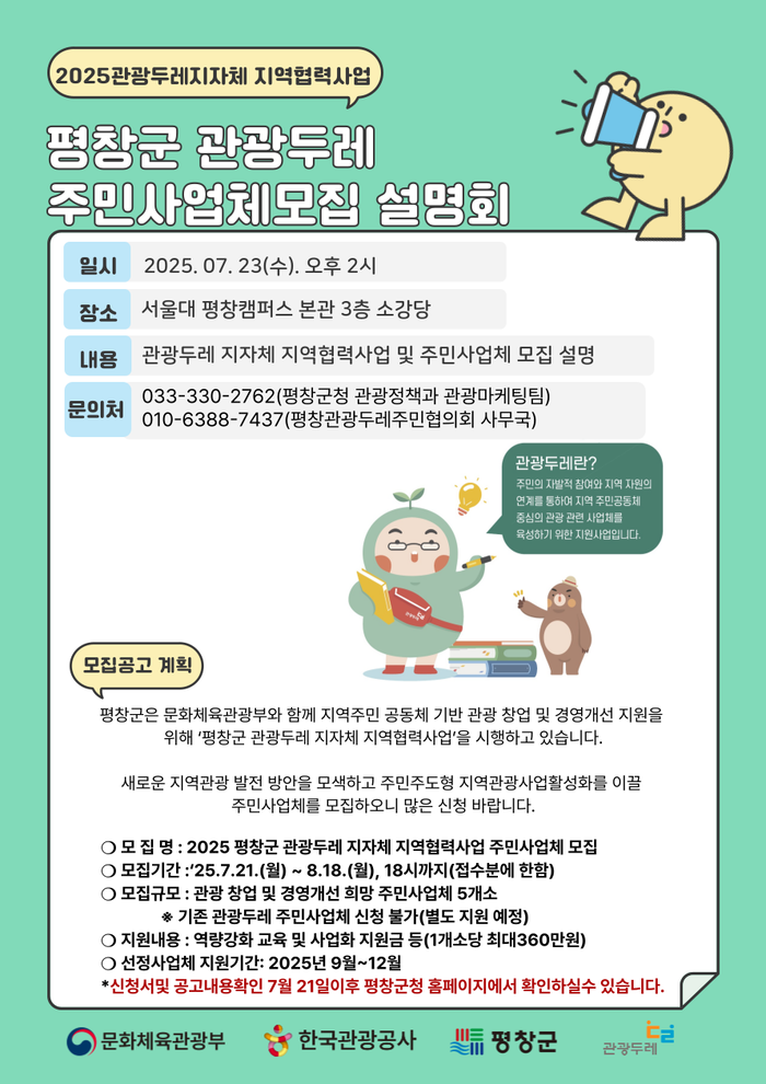 [스포츠서울ㅣ김기원기자]평창군은 2025 평창군 관광두레 지자체 지역 협력사업 주민사업체를 7월 21일부터 8월 18일까지 모집한다.