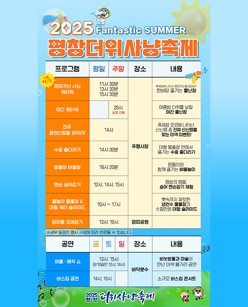 ‘2025 평창더위사냥축제’는 “Fantastic Summer”라는 주제 아래 전야제(8월 1일)를 시작으로, 개막식(8월 2일)과 10일간 이어지는 다양한 문화·체험 프로그램으로 여름철 무더위를 날려줄 예정이다.