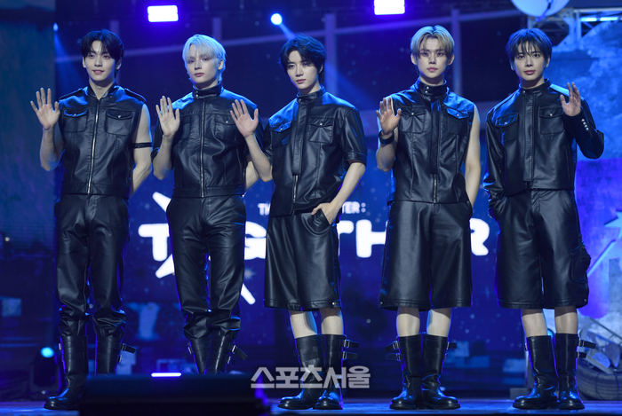 투모로우바이투게더 수빈, 휴닝카이, 범규,연준,태현(왼쪽부터)이 21일 서울 경희대 평화의전당에서 열린 정규 4집 ‘별의 장: TOGETHER’ 발매 기념 미디어 쇼케이스에서 포즈를 취하고 있다.