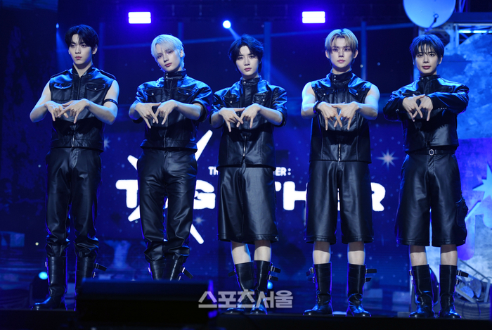 투모로우바이투게더 수빈, 휴닝카이, 범규,연준,태현(왼쪽부터)이 21일 서울 경희대 평화의전당에서 열린 정규 4집 ‘별의 장: TOGETHER’ 발매 기념 미디어 쇼케이스에서 포즈를 취하고 있다.