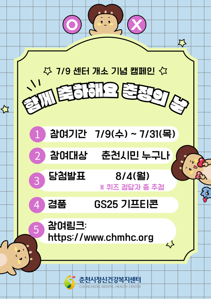 이번 캠페인은 ‘함께 축하해요, 춘정의 날’을 주제로 센터 개소일(7월 9일)을 맞아 마련됐다. 시민 누구나 센터 누리집(www.chmhc.org)을 통해 간편하게 참여할 수 있으며 OX 퀴즈 정답자 중 추첨을 통해 GS25 모바일 상품권도 증정된다. 퀴즈와 함께 정신건강 응원 메시지를 남기면 캠페인 참여가 완료된다.