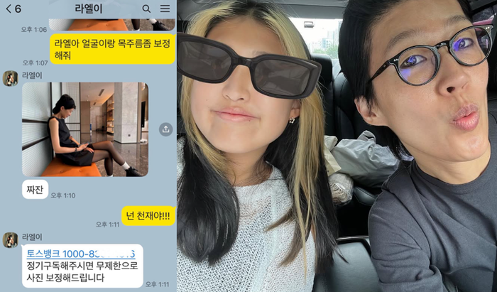 이날 공개된 사진 속엔 홍진경이 딸 라엘과 주고받은 대화가 담겨있다. 홍진경이 “얼굴이랑 목주름 좀 보정해달라”며 자신의 사진을 보내자 라엘이가 순식간에 이를 완성했다.