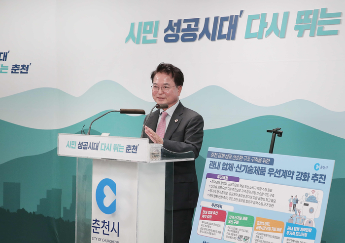 육동한 춘천시장은 23일 시청 브리핑룸에서 언론브리핑을 열고 ‘관내 업체 우선 계약 강화 및 신기술 제품 구매 추진 계획’을 발표했다.