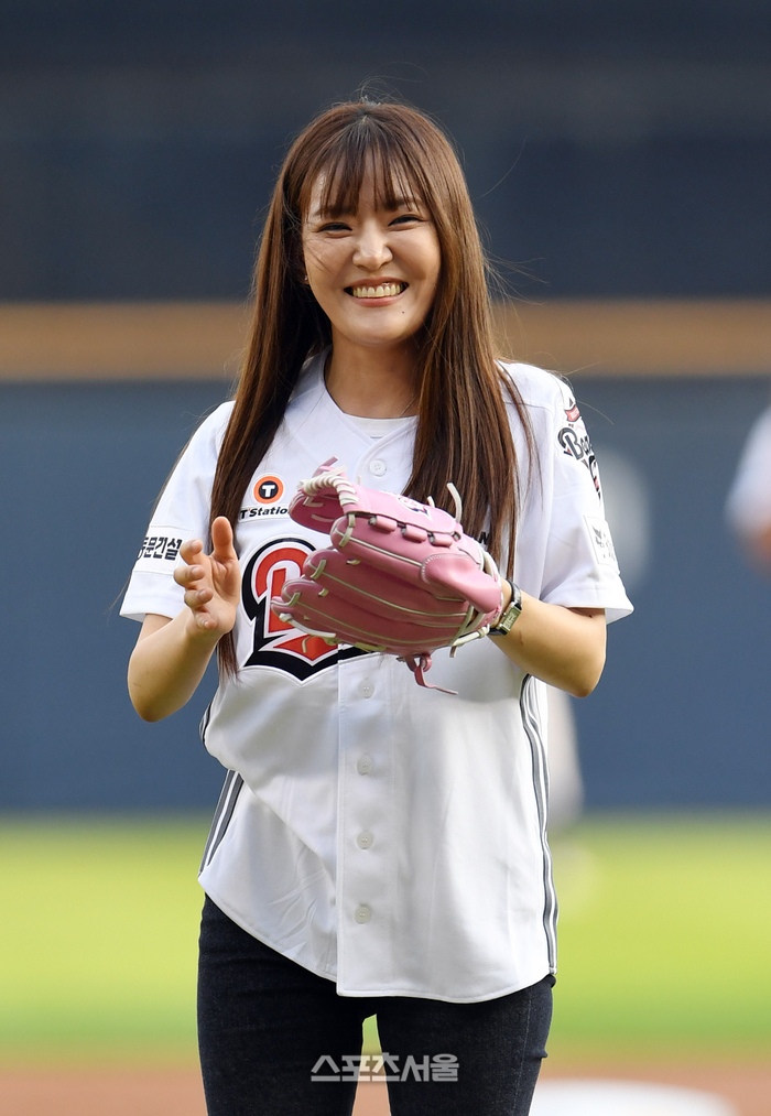 박은영 셰프가 23일 잠실구장에서 열린 2025 KBO리그 한화와 두산의 경기에 앞서 시구를 한 뒤 환하게 웃고 있다.
