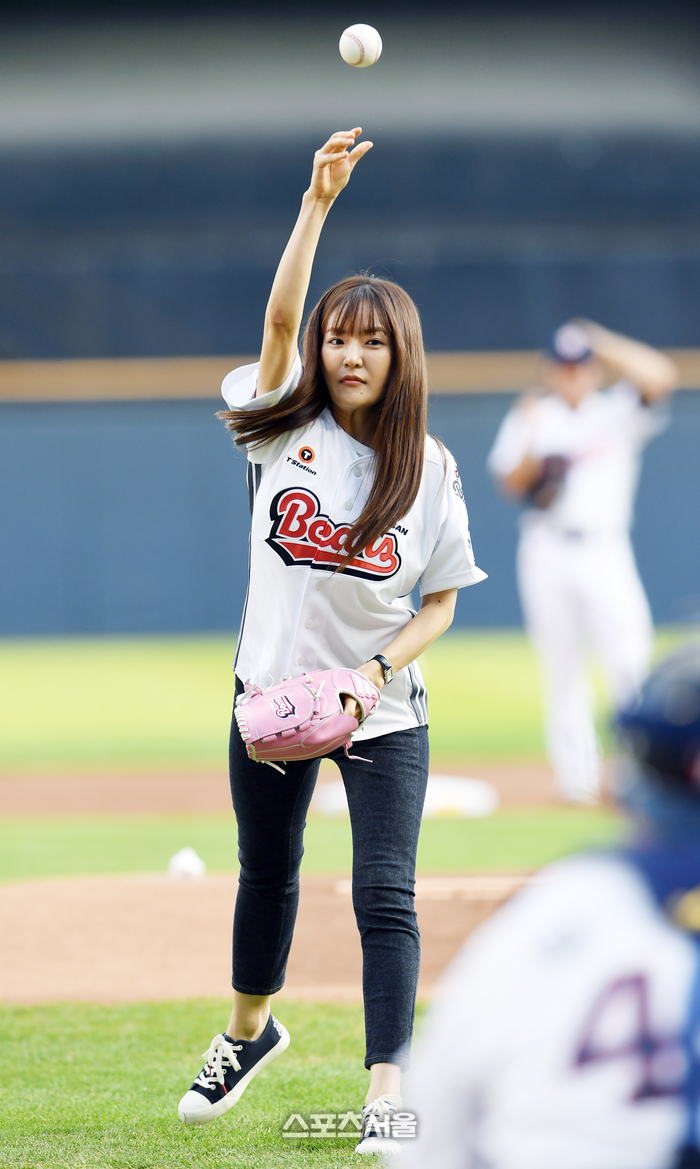 박은영 셰프가 23일 잠실구장에서 열린 2025 KBO리그 한화와 두산의 경기에 앞서 시구를 한 뒤 환하게 웃고 있다.