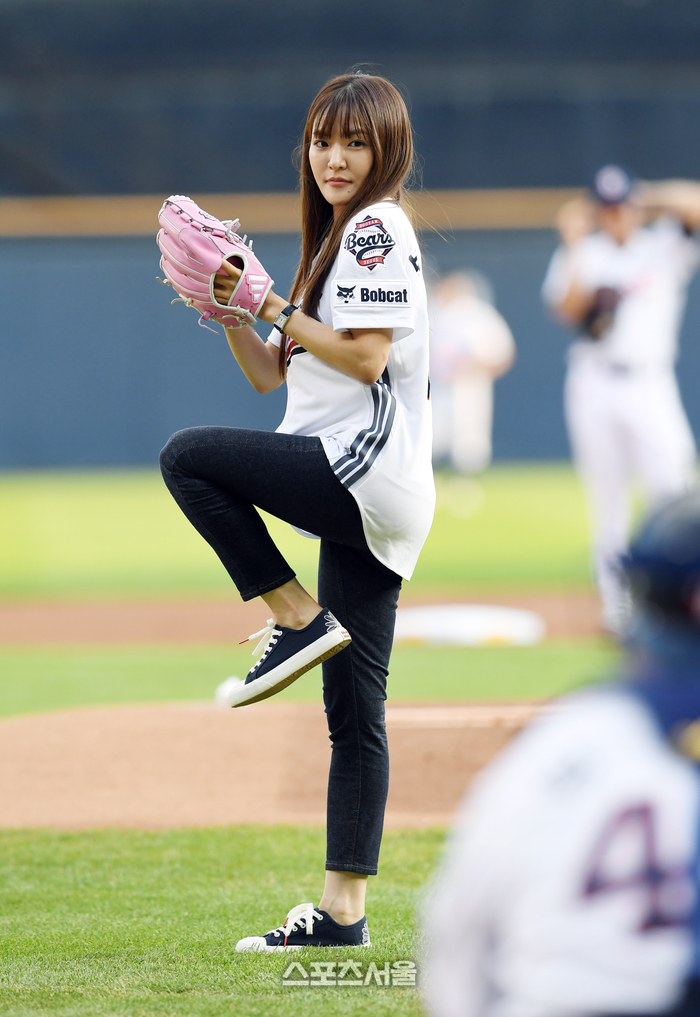 박은영 셰프가 23일 잠실구장에서 열린 2025 KBO리그 한화와 두산의 경기에 앞서 시구를 한 뒤 환하게 웃고 있다.