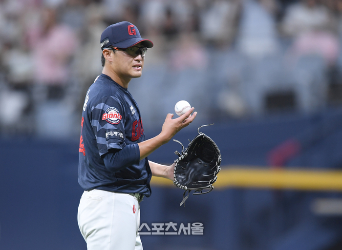 롯데 선발투수 박세웅이 23일 서울 고척스카이돔에서 열린 2025 KBO리그 키움과 경기 7회말 2사2루 상대 오선진에 적시2루타를 허용한 후 아쉬워하고 있다.