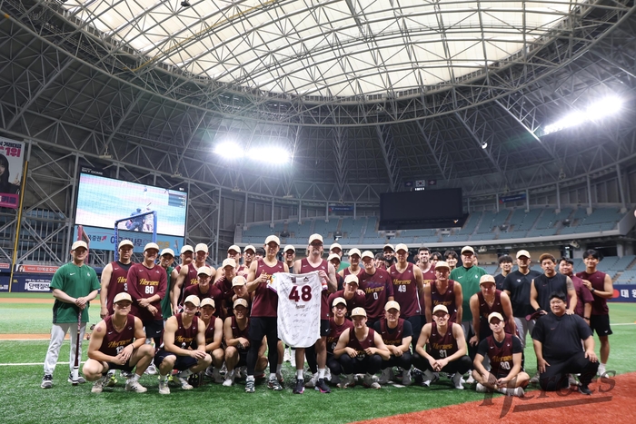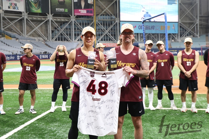 이날 훈련 전 그라운드에 선수단 전원이 모인 가운데, 주장 송성문이 웰스에게 선수단의 친필 사인이 담긴 유니폼을 비롯해 KBO리그 첫 승, 첫 탈삼진 기념구를 전달했다.