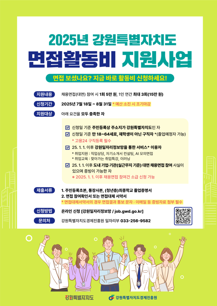 [스포츠서울ㅣ원주=김기원기자]강원특별자치도경제진흥원(원장 서동면)이 2025년 면접활동비 지원사업 신청자를 8월 31일까지 선착순 모집한다.