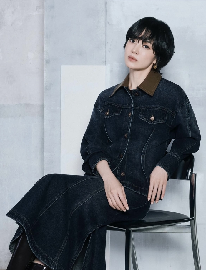 공개된 사진 속 송혜교는 세련된 데님 룩으로 시선을 끌었다. 송혜교는 데님 소재의 재킷에 롱 스커트를 착용하고 의자에 앉아 우아하면서도 시크한 매력을 발산하고 있다.