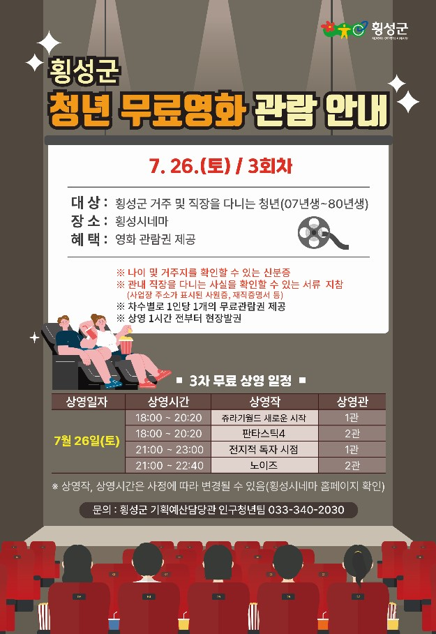 [스포츠서울ㅣ김기원기자]횡성군은 지역 청년들에게 문화 향유 기회를 제공하고자 ‘횡성군 청년 무료영화 관람 지원사업’을 운영하고 있다.