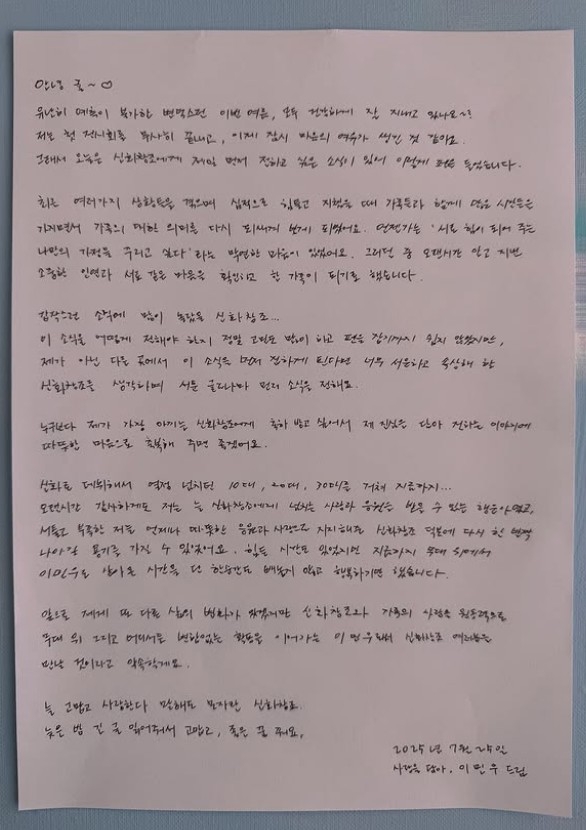 한편, 이민우는 이날 밤 팬카페에 직접 자필 편지를 올려 결혼 소식을 전했다. 그는 “오랜 시간 알고 지낸 소중한 인연과 같은 마음을 확인하고 한 가족이 되기로 했다”며 “이 소식을 어떻게 전할지 고민 끝에 신화창조에게 가장 먼저 알리고 싶었다”고 밝혔다.
