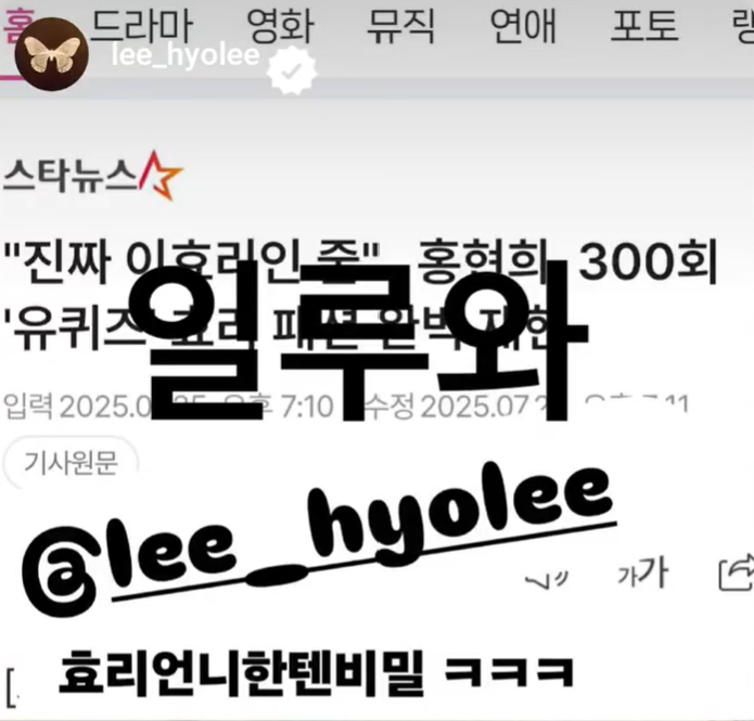 홍현희는 26일 자신의 SNS 계정에 “효리 언니한테는 비밀”이라는 글과 함께 기사를 캡처한 사진을 게재했다.