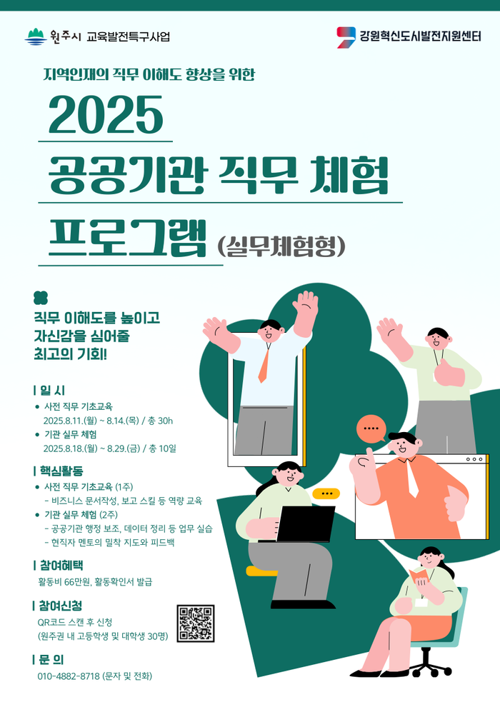 [스포츠서울ㅣ춘천=김기원기자](재)강원혁신도시발전지원센터(센터장 장유진)는 원주시 교육발전특구 사업의 일환으로 오는 8월 11일부터 29일까지 지역 청년들에게 공공기관 실무 경험을 제공하는 「2025 공공기관 직무 체험 프로그램」을 운영한다. 이 프로그램은 강원혁신도시내 주요 공공기관과의 협력을 통해 지역 청년들이 실질적인 직무 경험을 쌓고 취업 경쟁력을 높일 수 있는 기회를 제공하기 위해 기획되었다.