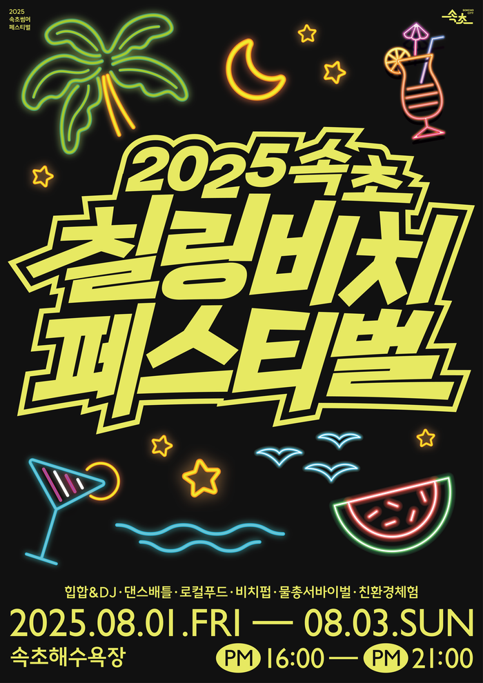 [스포츠서울ㅣ김기원기자]속초시는 오는 8월 1일(금)부터 3일(일)까지 속초해수욕장 야외무대 일원에서 한여름의 더위를 식혀줄 특별한 해변 축제 ‘2025 속초 칠링비치 페스티벌’을 개최한다. 이번 축제는 무더운 여름을 시원하게 즐기며, 속초에서만 누릴 수 있는 감각적인 여름 경험을 제공하는 것을 목표로 한다.
