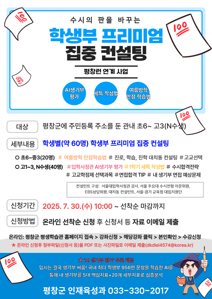 또한, 고등학생(1~3학년)을 대상으로는 AI생기부 평가, 세특 작성 및 피드백, 학생부 및 모의고사 상세분석, 면접합격 TIP 등 수시합격의 필수인 학생부 중심으로 집중 컨설팅을 진행한다.