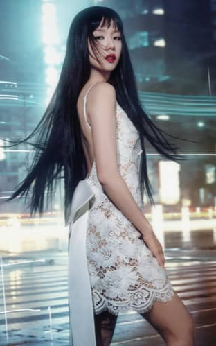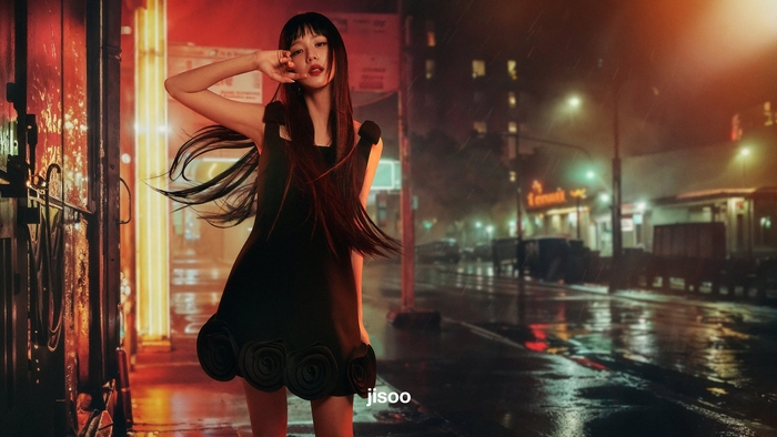 지수는 네온빛으로 물든 가상의 도시를 배경으로, 블랙 3D 크레이프 플라워 미니 드레스, 퍼 커프 디테일이 강조된 블랙 부클 재킷, 화이트 레이스 미니 드레스 등을 소화하며 현실과 환상을 넘나드는 무드를 연출했다.