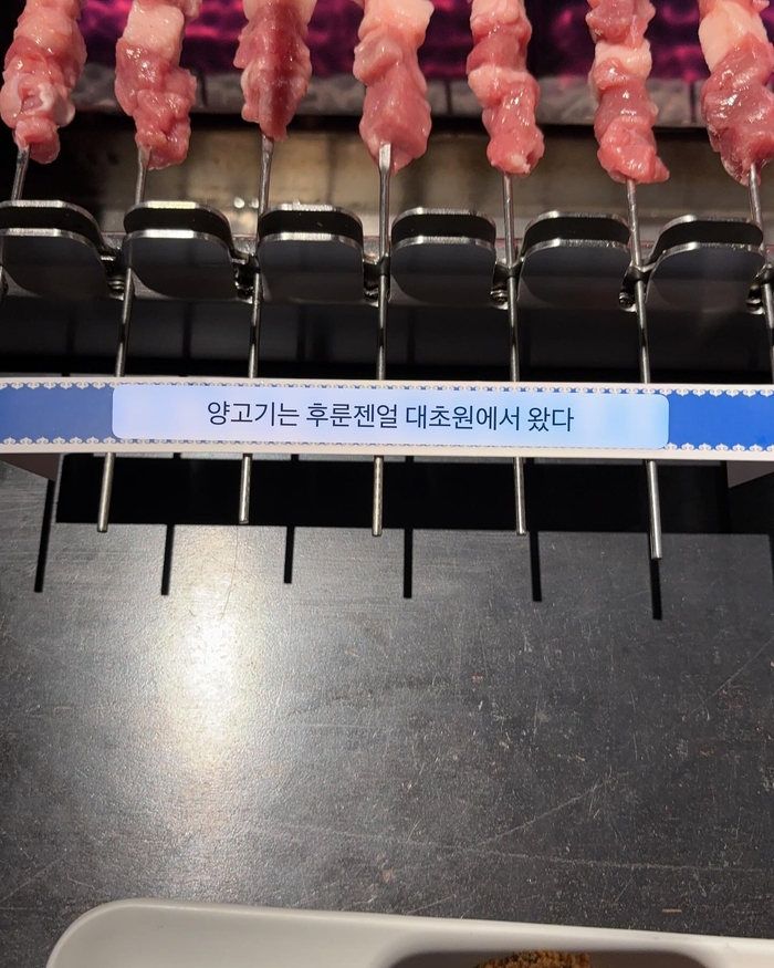 그는 양꼬치의 소스를 앞에 두고 행복한 모습으로 꼬치가 익기를 기다리고 있다. 이어 “더운데 선풍기도 주고...친절해규...”라며 친절한 서비스에 감탄하며 미소를 짓는 모습이다.