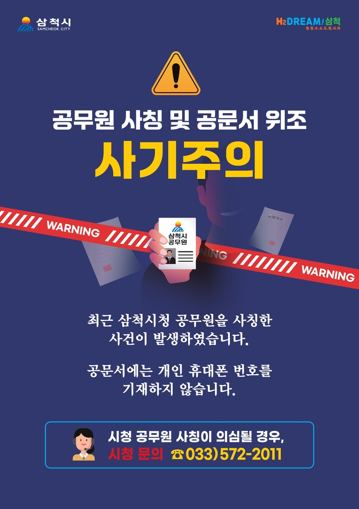 [스포츠서울ㅣ김기원기자]삼척시는 최근 시청 공무원을 사칭한 보이스피싱 사례가 관내에서 잇따라 발생함에 따라, 시민들의 피해 예방을 위해 각별한 주의를 당부했다.