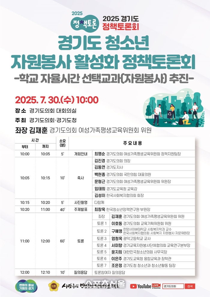 토론회는 경기도 청소년 정책에 관심 있는 누구나 참석할 수 있으며, 유튜브 ‘경기도의회’ 공식 채널을 통해 실시간 생중계될 예정이다.