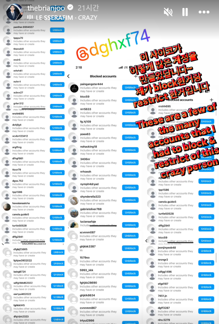 해당 내용을 영상으로 올린 브라이언은 끝 없는 스크롤로 엄청난 악플을 받았음을 알렸다. 브라이언은 수십 개의 계정 사진을 올리며 “이 사이코가 이렇게 많은 계정을 만들었다. 제가 차단한 거다”라고 덧붙였다.