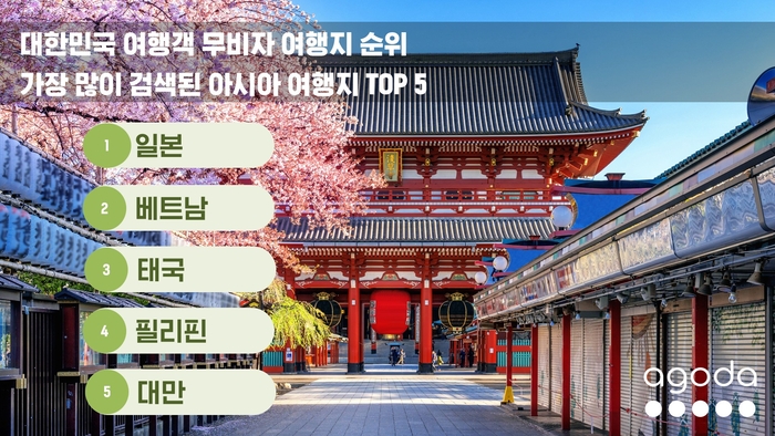 디지털 여행 플랫폼 아고다는 30일 대한민국 여행객들이 30일 이상 무비자 체류가 가능한 아시아 및 유럽 여행지 순위를 발표한 결과 일본이 1위를 차지했다. 이어 베트남, 태국, 필리핀, 대만 등이 꼽혔다. 이번 순위는 올 1월부터 5월까지 아고다 플랫폼 내 대한민국 여행객들의 숙소 검색 데이터를 기반으로 집계됐다.