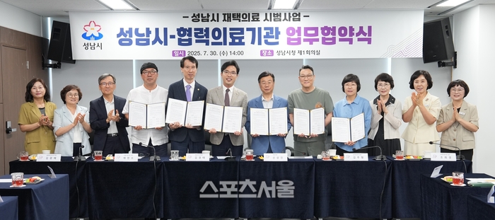 시는 이날 시청 4층 제1회의실에서 성남시의사회, 집으로의원, 연세가정의원, 서울가정의원, 새한베스트의원, 연세생명나무내과의원과 ‘재택의료사업 추진을 위한 업무협약’을 맺었다.