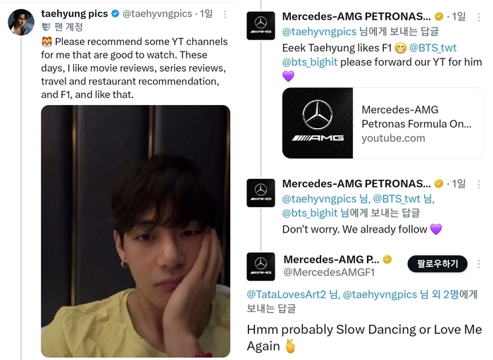 F1 참가팀인 메르세데스-AMG 페트로나스 포뮬러 원 팀 공식 계정은 “이크! 태형이가 F1을 좋아한다. 태형이에게 우리 유튜브 영상을 좀 보내줘”라며 유튜브 링크를 직접 공유했다.