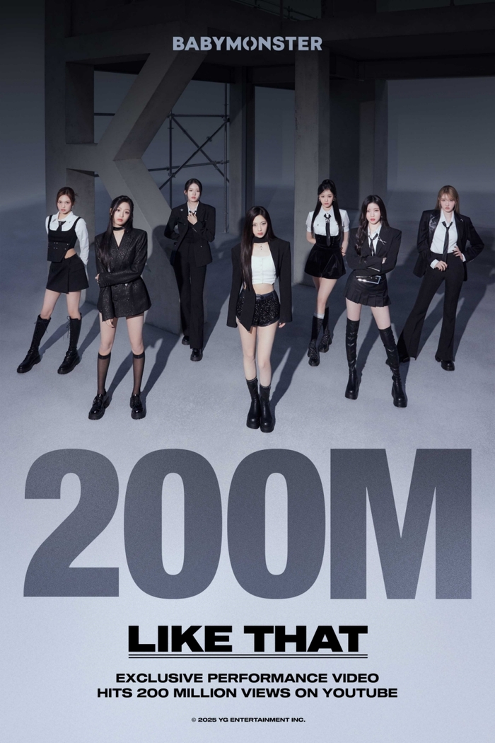 YG엔터테인먼트는 30일 “베이비몬스터의 ‘LIKE THAT’ 익스클루시브 퍼포먼스 비디오가 이날 오후 2시 유튜브 조회수 2억 회를 돌파했다”고 밝혔다. 해당 영상은 지난 5월 31일 공개된 이후 약 1년 2개월 만에 2억 뷰 고지를 넘어섰다.