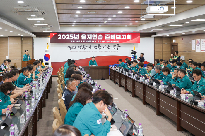 [스포츠서울ㅣ원주=김기원기자]원주시는 30일 오후 3시 30분 시청 10층 대회의실에서 원강수 원주시장을 비롯한 관계자 100여 명이 참가한 가운데, ‘2025 을지연습 준비보고회’를 개최했다.