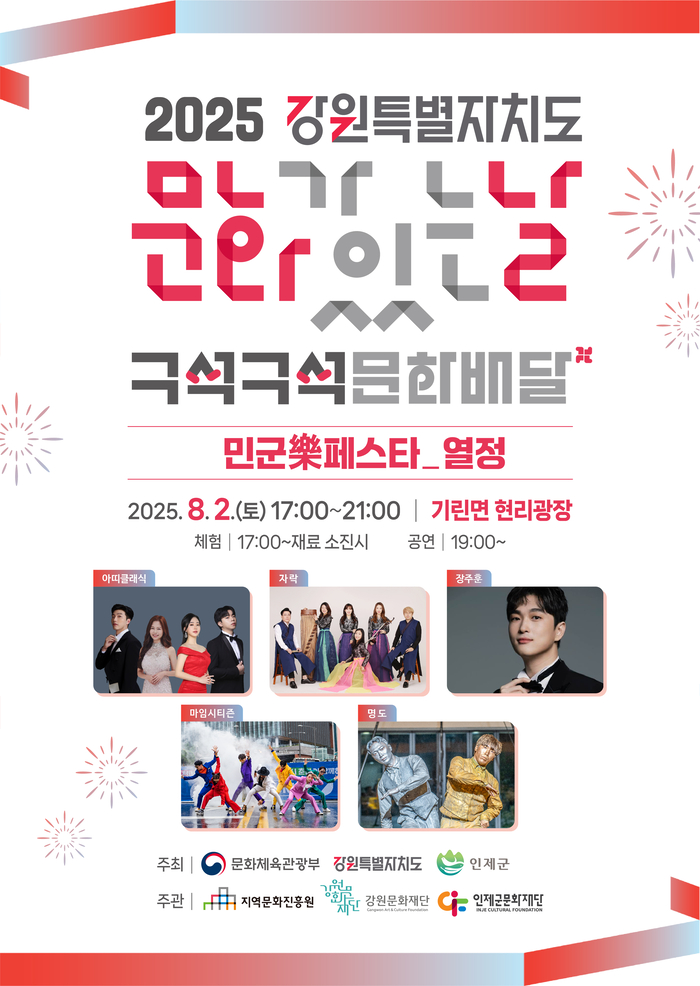 [스포츠서울ㅣ김기원기자]오는 8월 2일 토요일 ‘2025 문화가 있는 날 <구석구석 문화배달-민군樂 페스타-열정>’이 기린면 현리광장으로 찾아간다.