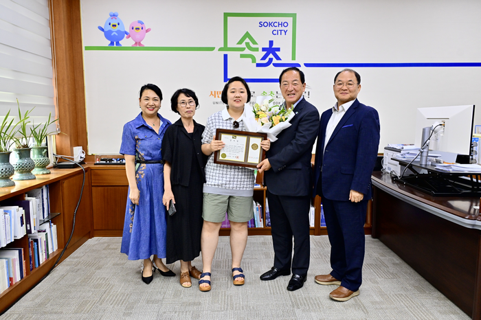 [스포츠서울ㅣ김기원기자]이병선 속초시장은 7월 31일 집무실에서 자폐성 발달장애를 안고도 편견을 넘어선 창의적 활동을 이어가며 장애 인식 개선에 공헌한 서양화가 이다래 작가를 초청해 감사패를 전달했다.