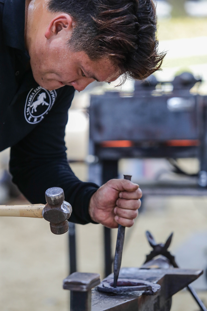 편자의 재료가 되는 쇠는 원래 ‘I’자형인데 이를 뜨거운 불에 달구어 경주마의 발굽에 맞게 구부리고 다듬어 발굽에 부착해야 한다. 뜨거운 화덕에서 갓 구워낸 쇠를 다루다 보니 현장 온도는 50도를 넘기기 일쑤다.