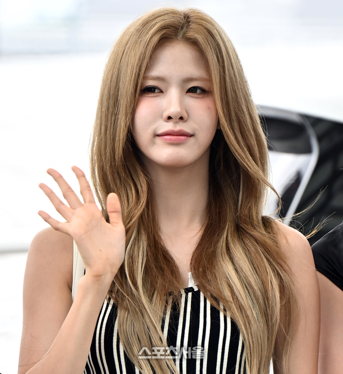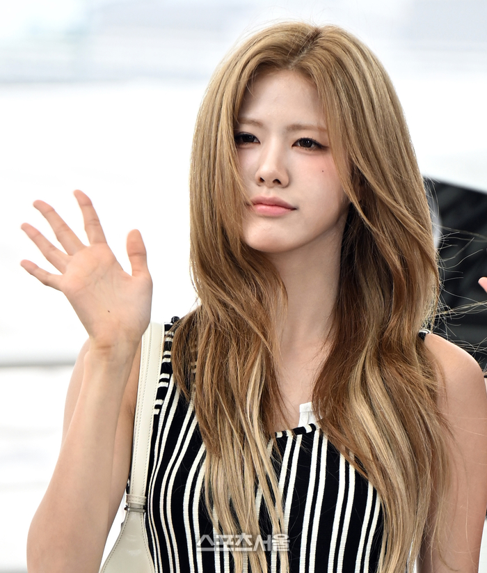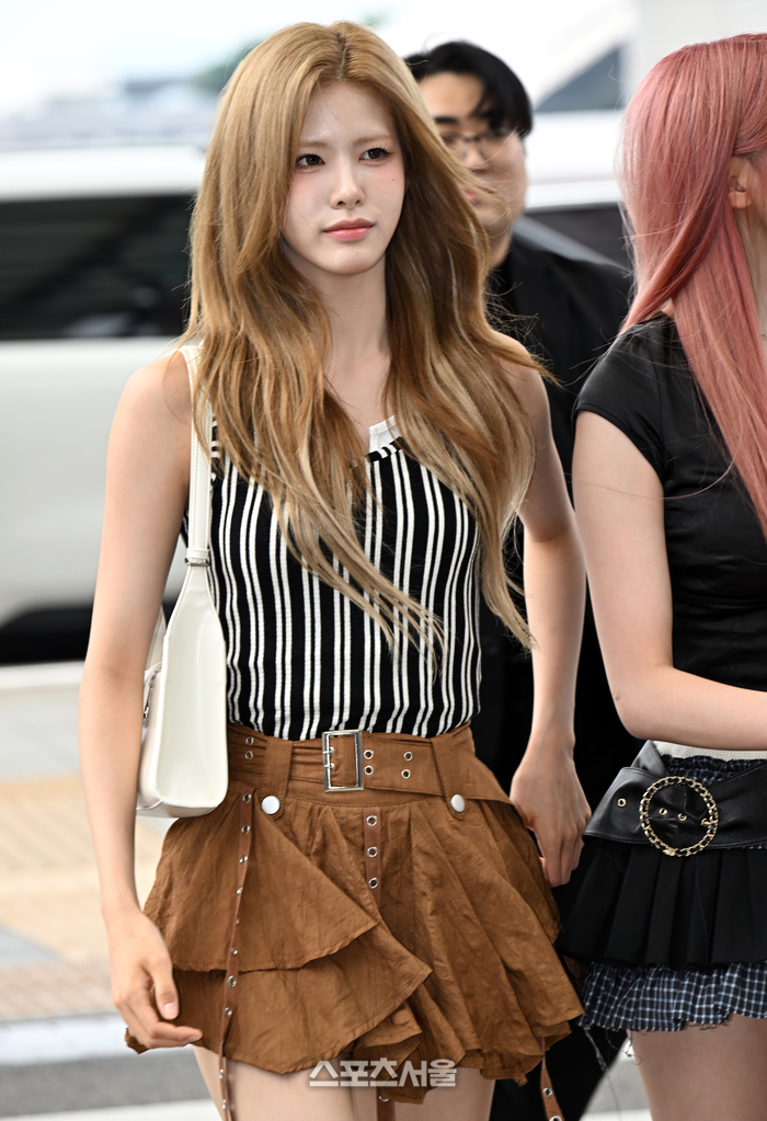 눈부신 금갈색의 헤어로 팬들의 시선을 사로잡은 라희는 검은색과 흰색 세로 줄무늬가 있는 민소매와 스쿱넥의 상의로 매력을 발산했다.
