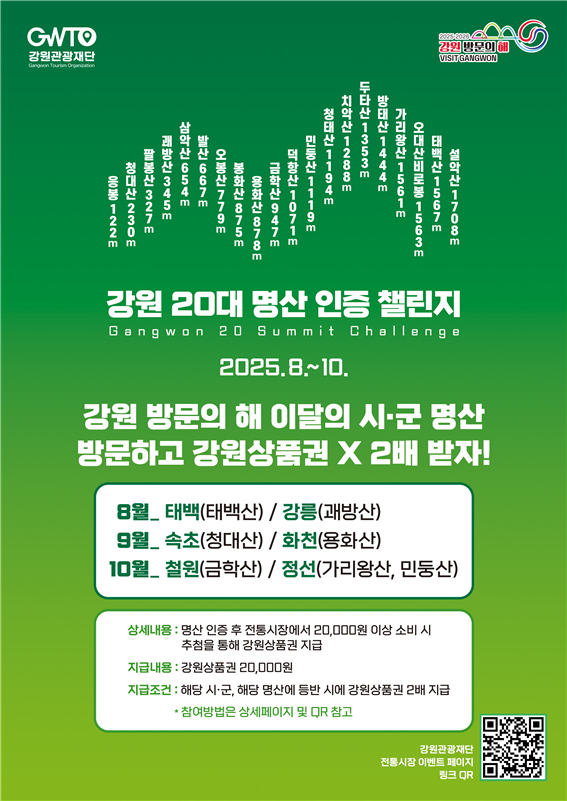 [스포츠서울ㅣ춘천=김기원기자]강원특별자치도와 강원관광재단(대표이사 최성현, 이하 재단)은 ‘2025-2026 강원 방문의 해’를 맞아 강원 20대 명산 인증챌린지 전통시장 이벤트를 확대하여 운영한다고 밝혔다.