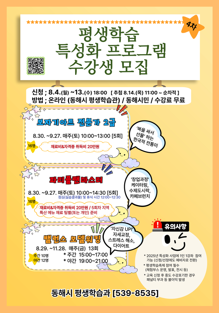[스포츠서울ㅣ김기원기자]동해시(시장 심규언)는 지역 주민의 학습욕구 충족과 취‧창업 역량강화를 위한 2025년도 평생학습 특성화 프로그램[4차]으로 3개 교육과정을 개설하고, 오는 8월 4일부터 13일까지 동해시 평생학습관 누리집을 통해 수강생을 모집한다고 밝혔다.