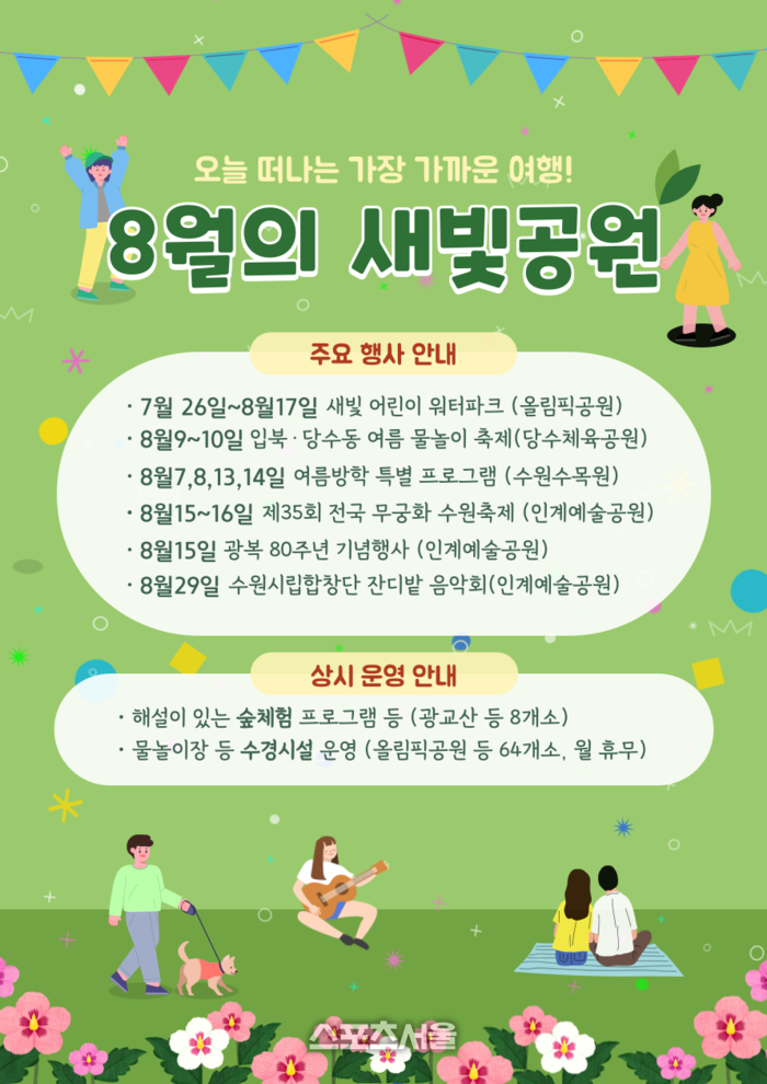 또 ▲올림픽공원 ‘새빛 어린이 워터파크’(7월 26일~8월 17일) ▲당수체육공원 ‘입북·당수동 여름 물놀이 축제’(9~10일) ▲인계예술공원 ‘수원시립합창단 잔디밭 음악회’( 29일) 등 다채로운 프로그램을 운영한다.