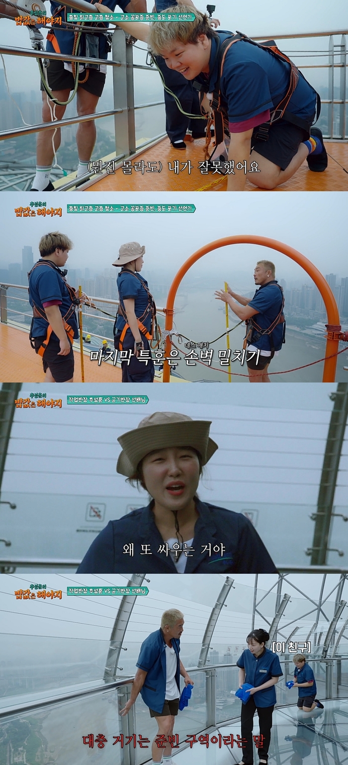 이날 고소공포증이 있는 곽준빈은 아찔한 풍경이 내려다보이는 스카이 브리지 청소에 적응하지 못해 추성훈의 도움을 받는다. 간담을 서늘하게 만드는 아르바이트에 이은지가 “이렇게 목숨을 걸고 해본 건 처음인 것 같다”고 하자 곽준빈은 아르바이트 13개 경력 중 “이게 제일 힘들다. 정신적으로”라며 인생 최고난도 아르바이트로 꼽는다고.
