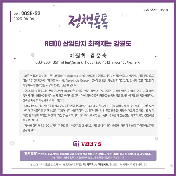 [스포츠서울ㅣ춘천=김기원기자]강원연구원(원장 현진권)은 “RE100 산업단지 최적지는 강원도”라는 제목으로 2025년 제32호 정책톡톡을 발간했다.