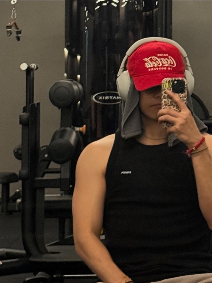 또 다른 사진에서는 민소매 회색 티셔츠에 귀여운 니트 모자와 헤드폰을 착용하고 음악을 듣고 있다.