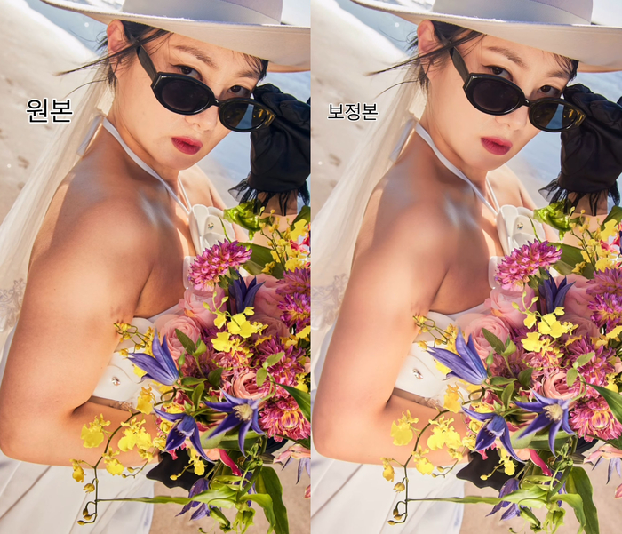 꽃을 든 사진의 경우 보정본으로 올린 사진이 원본 보다 좌우 사이즈가 살짝 줄어든 탓도 있지만 박나래의 팔뚝이나 얼굴이 조금 더 얇아지고 갸름해진 모습을 볼 수 있다. 전체적으로 두드럽게 다듬어 피부톤 역시 매끈해 보이게 바뀌었지만 박나래의 모습 자체를 크게 훼손할 만큼은 아닌 것으로 보인다.
