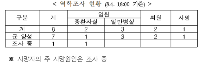 해당 의료기관은 보건당국의 시술 중단 권고에 따라 8.1일(금)부터 휴진하였으며, 강릉시보건소는 최근 2주이내 동일 시술받은 대상자(269명)를 우선 확인하고, 단계적으로 대상을 추가하여 건강이상유무***를 조사할 계획이다.