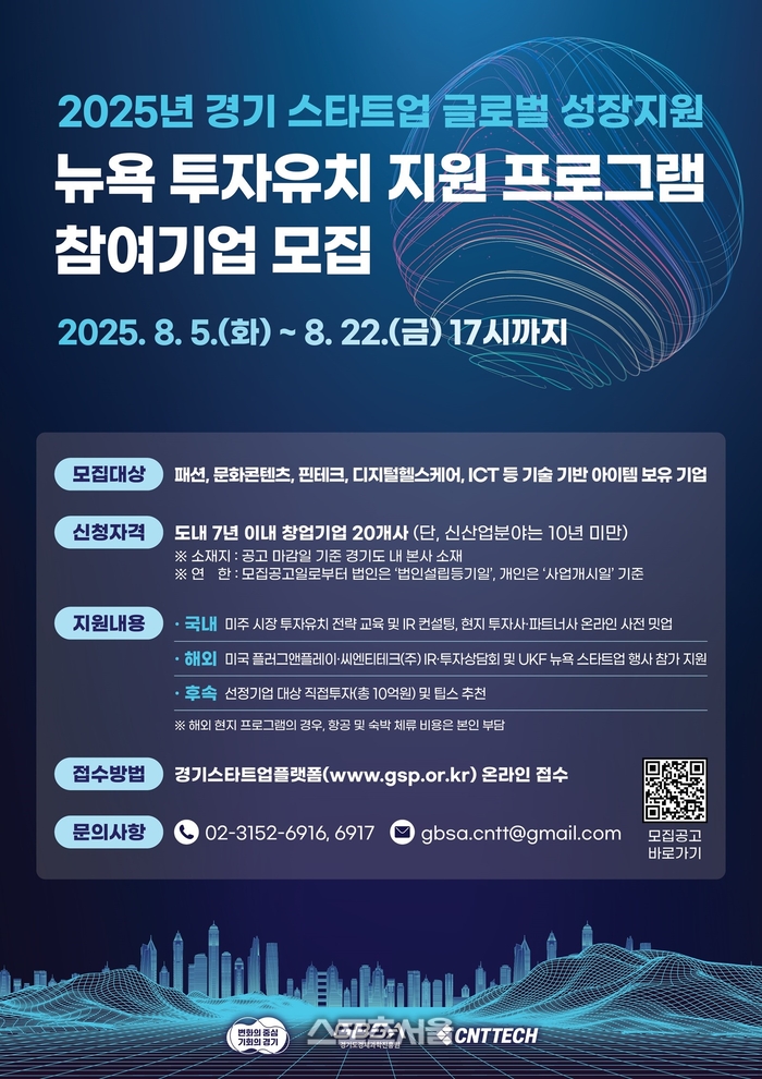 선정 기업에는 ▲글로벌 진출 역량 진단 ▲IR 역량 강화 컨설팅 ▲뉴욕 투자유치 설명회(IR) 및 1:1 투자상담 ▲미국한인창업자연합(UKF) 주최 글로벌 스타트업 행사(KOOM 2025) 참가 ▲후속 투자 연계까지 전 과정을 지원한다.
