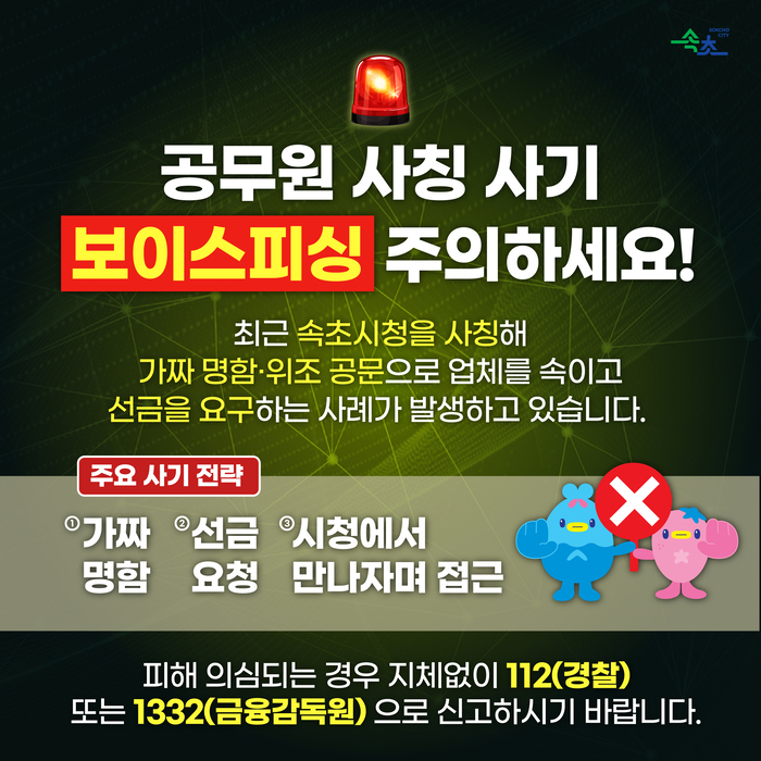 [스포츠서울ㅣ김기원기자]속초시가 최근 허위 공문서·공무원증·명함 이용 공무원 사칭 사기 사건이 빈번하게 발생함에 따라 각별한 주의를 당부하고 나섰다.