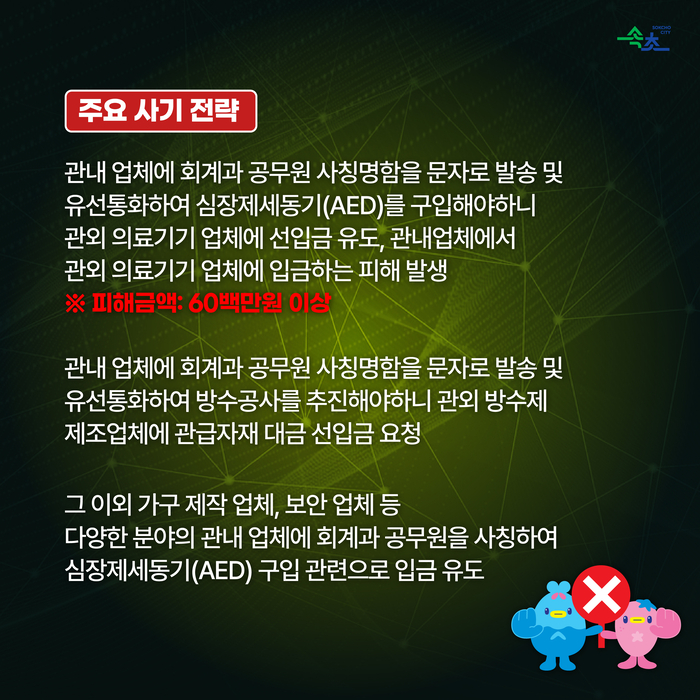 최근 속초시 관내에서도 유사한 수법의 사기 시도가 다수 발생하고 있으며, 일부 업체가 금전적 피해를 당한 사례도 발생한 것으로 파악됐다. 주로 의료기기나 방역물품, 기타 공사용 자재 등을 구매하는 것처럼 위장해 특정 업체에 입금을 유도한 것으로 알려졌다. 또한, 출장 음식 주문을 빙자한 연락 사례도 접수된 바 있다.