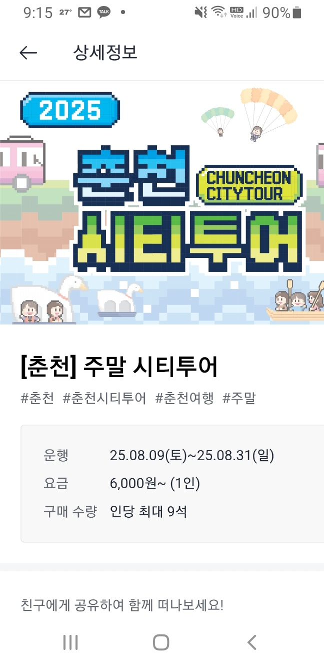 춘천시(시장 육동한)는 종합 모빌리티 플랫폼 ‘카카오T’를 통해 춘천 시티투어 예약 서비스를 시작했다고 5일 밝혔다.